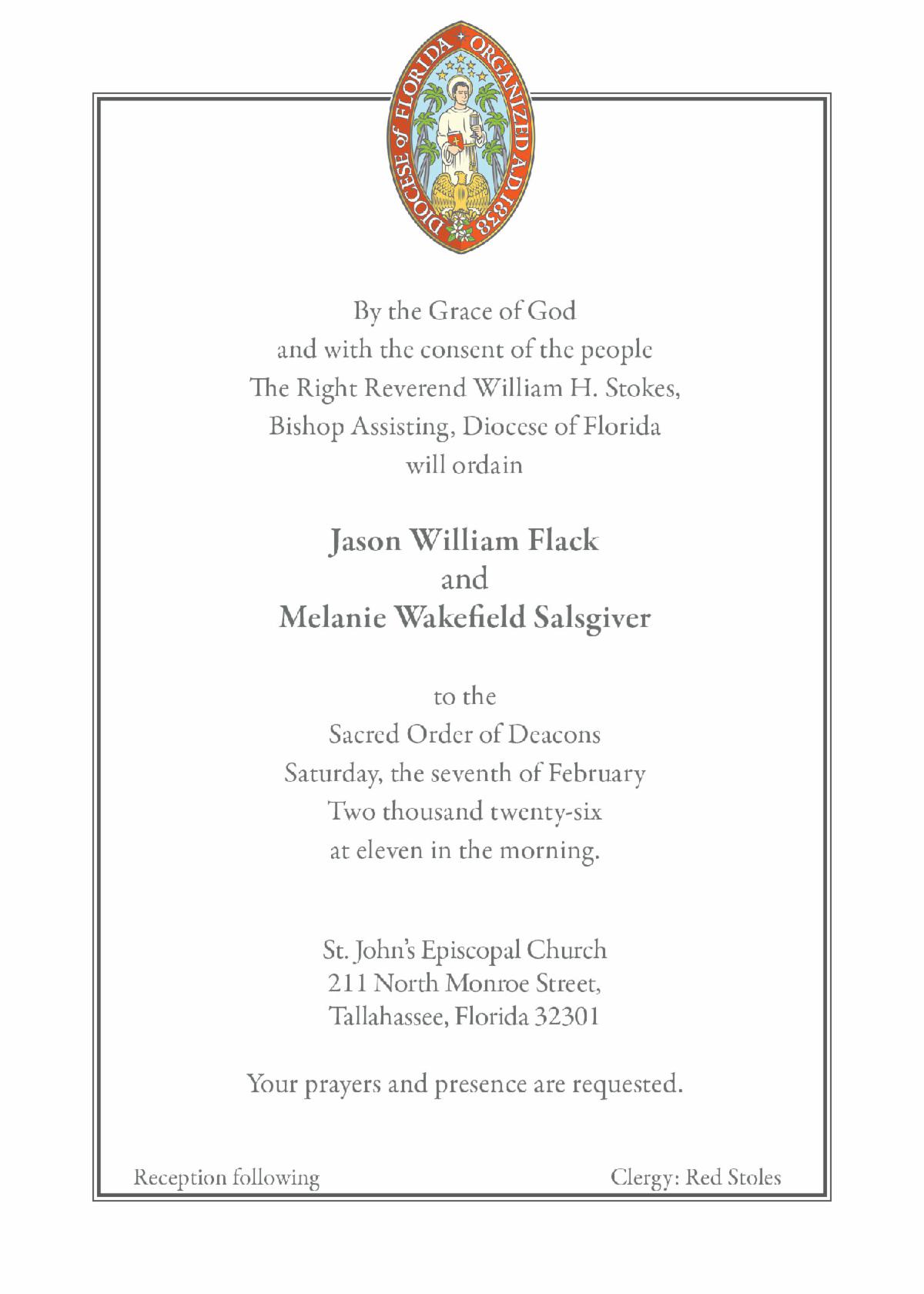 Ordination of Jason Flack and Melanie Salsgiver to the Sacred Order of Deacons By Episcopal Dioscese of Florida on January 27, 2026 Posted in: News Please join us at St. John’s Episcopal Church, Tallahassee on February 7 at 11:00 a.m. for the ordination of Jason Flack and Melanine Salsgiver to the diaconate. A formal invitation is below; no R.S.V.P. is required.